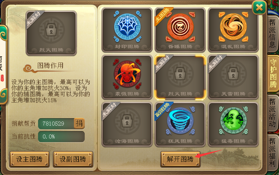 帮派贡献度:用于增加图腾对人物的附加抗性。