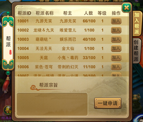 当玩家等级达到40级后,将开启帮派功能。这时,玩家可以自行创建帮派或者加入自己喜欢帮派。点击“帮派”,可以进入帮派界面。