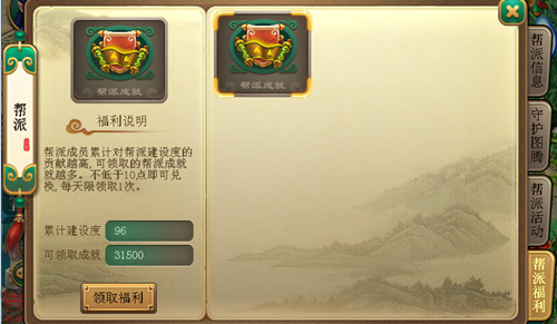 领取帮派福利:获得建设度之后,每日可领取1次帮派福利。每10点建设度等于3500点帮派成就点。