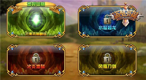 元素结界副本中总共有4大属性章节,分别为地裂山崩、水怒如龙、火炎地狱、风霜刀剑,各大章节在不同时间开放,难度从简单、一般到困难依次增加,玩家可以自由选择难度,副本中会随机刷出4个大BOSS,只要在限定时间内战胜4个BOSS,就能闯关成功,获得丰厚奖励。