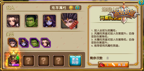 在战斗之前,我们需要考虑一下英雄的属性,如果选择了被克制属性的英雄,受到的伤害提升,对敌人的伤害反而降低,所以,我们需要选择能够克制BOSS属性的英雄,获得压制优势来战胜BOSS。在准备界面的左边,系统有专门的提示,英雄头像旁边绿色的上升箭头代表克制和可以上场,红色的下降箭头则代表被克制和不能上场,各位要尽量注意。