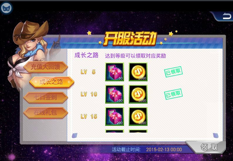 3)参加成长之路,幸运赠送等活动,满足活动要求就可以得到金币和红钻。