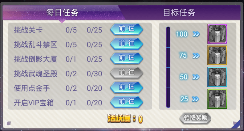 2)完成日常,获得规定的活跃点数,领取礼包,得到金币和红钻。