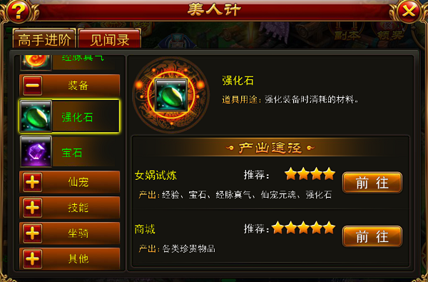 强化石获取途径:女娲试炼、商城、秘宝仙宫;