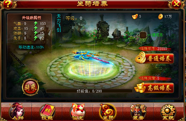 又做了几个任务达到了12级呢,在这个时候开启了新的玩法“坐骑”,通过游戏界面右下角的菜单→坐骑→培养,便能够看到坐骑的基础属性了。并且可以通过使用铜钱的普通培养以及消耗元宝的高级培养来给坐骑升级,不同方式的培养获得的经验是不一样的。游戏中还有各种形态的坐骑,通过化形可以看出一二,大家可以多多游戏多多发现哦。
