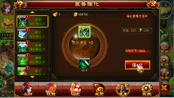 当人物达到25级的时候,装备就可以进行强化啦!通过菜单→装备→强化/进阶的按钮就能够进入下图所示的两个界面哦,当升级材料够的时候装备就能够升级和进阶了,升级/进阶后属性会得到较大的提高。