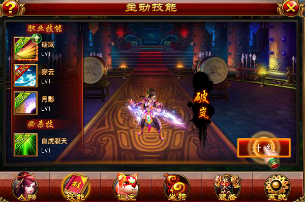 在人物达到20级的时候将会开启主动技能,通过菜单→技能→主动技能便能够看到自己的技能界面啦!每个职业都有属于自己的三种技能和一个必杀技,技能等级的不同对怪物的伤害效果不一样。