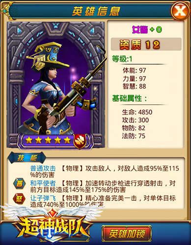 属性分析:女警的数值属性在12资质的5星紫色英雄里还是很不错的,虽然官方定位她是远程输出英雄,但我给他的定位却是刺客,这主要和她的技能有关。