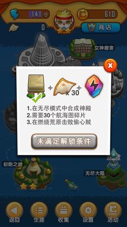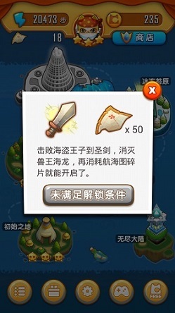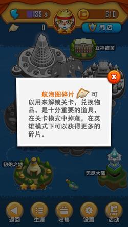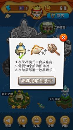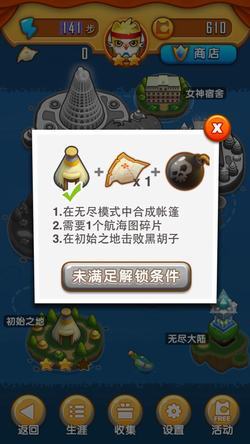 航海图并不是一张完整的地图,而是被毁坏成了许多碎片,在游戏过程中,如果我们成功通关就会从敌人身上缴获这些碎片,解锁每一关卡都需要数量不等的航海图。酸果部落的开启除了需要航海图碎片之外,还要在无尽模式中合成帐篷,初始之地打败复仇者黑胡子。