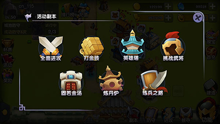 在进攻过程中也别忘了游戏中的活动副本。那可是个大宝库,金币,经验丹,各种士兵,武将,防御塔都可能从中获得。可以极快的提升你的战斗力以及防御力。