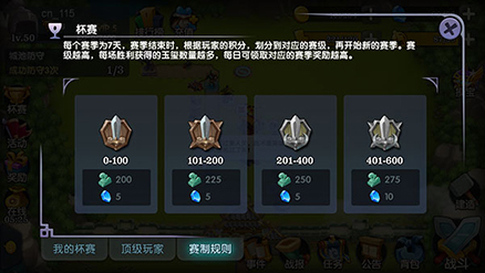 说完了剧情模式,来说说对战吧。PVP的积分会一直累积,可以在杯赛那儿查看当前的PVP积分。杯赛的奖励每7天发放一次,并且是根据排名的区间发放奖励。就是说如果你的排名是105,请一定要再赢几局,进入前100那么你的奖励便会翻几倍。而杯赛的奖励十分丰厚,奖励的玉玺是游戏中十分稀缺的资源。
