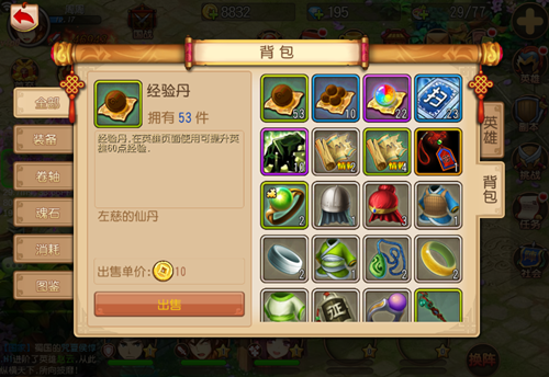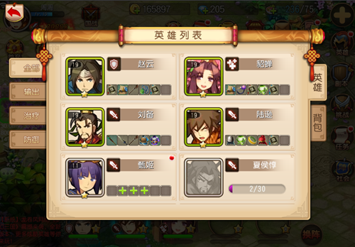 英雄界面分‘英雄’和‘背包’2个类别,显示在界面的右边。完成主线任务‘刘备出道’开启功能。