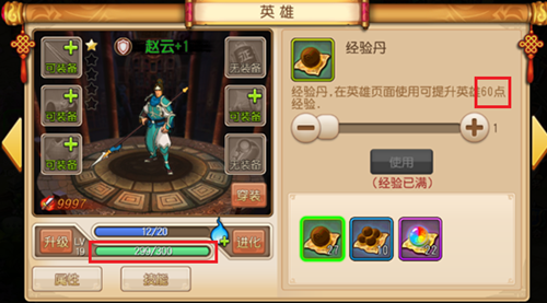 右边会出现经验丹,升级的时候,避免吃过多的经验浪费掉,可以看左下角的经验条再吃对应大小的经验丹哦。