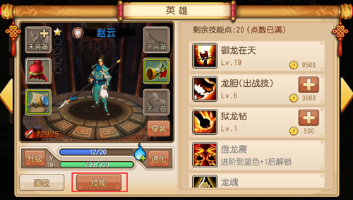 技能点:最高20点,系统1分钟增加1点技能点,20点封顶,技能点不足时,可花10钻石购买20点,没有次数限制。
