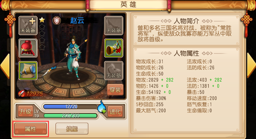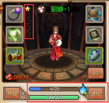 当前英雄的星级是1星,当获得了20个灵魂石之后,她可以进化到2星,最高进化成5星,当灵魂石不足的时候,点击加号区域会引导获得途径。