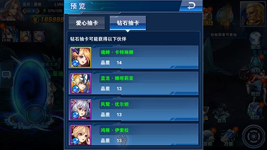 二、《星之门》抽奖和大多数游戏一样分为“爱心抽奖”和“钻石抽奖”,其中钻石抽奖更容易获得高级碎片和高级装备。不管是钻石抽奖还是金币抽奖都会定期给玩家免费抽取的机会,一定不能错过哟。