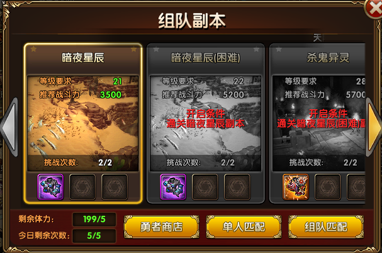 组队副本中现有【暗夜星辰】、【杀鬼异灵】、【泣血之夜】、【裁决之地】、【不灭斗志】、【战神之魂】6个副本,并且每个副本有普通和困难两种难度。组队副本奖励主要是大量的高级装备,装备在游戏中是非常重要的,每日参与组队副本也是必须要完成的哦!