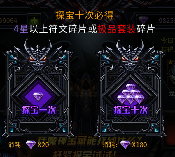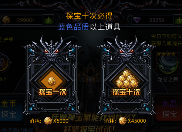 每天有5次免费机会,每次免费探宝间隔10分钟。免费次数用尽后使用金币可无限次探宝。十连抽价格优惠些哟,打9折。金币探宝可以随机获得1~3星符文技能或材料。金币十连抽至少会获得1个蓝色品质道具。如本次抽取的符文已拥有了,将会按照50%的比例转化为该符文的碎片。