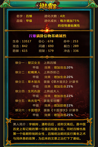满阶、满进化的吕雉基础攻击属性可以达到3200左右,暴力指数完全不输攻击流美人!在此基础上,吕雉全裸上阵就能增加攻击20%,如果缘分全部激活,总共可以获得近70%的攻击属性加成!吕雉的另一技能“天谴”,可按英雄160%的攻击对目标造成伤害,效果也是相当拔群!