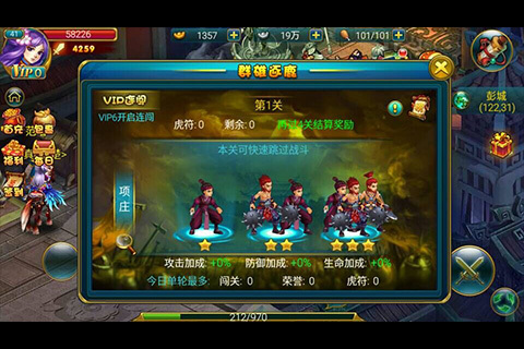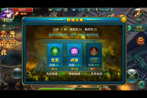 玩家每连续闯关4次,可以根据自身的需要、拥有虎符的数量以及对后续战略的考量,消耗虎符加成自身的攻击、防御或是生命属性,在接下去的闯关中更占优势!运筹帷幄、全盘布局的玩法大大增强了闯关的可玩性,只要足够聪明、有胆,终能傲视群雄,赢得天下!