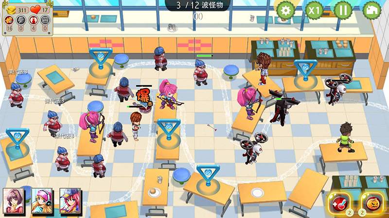 玩家操控1名英雄+3种防御塔,在校园背景的设计巧妙的10个关卡进行布置,并结合使用好收集的美女卡牌,阻击敌人的进攻,完成塔防任务。游戏的乐趣在于掌握3种防御塔9种形态的技能之后,熟练操作英雄,选择最佳的卡牌组合策略,打赢各个关卡的老怪。