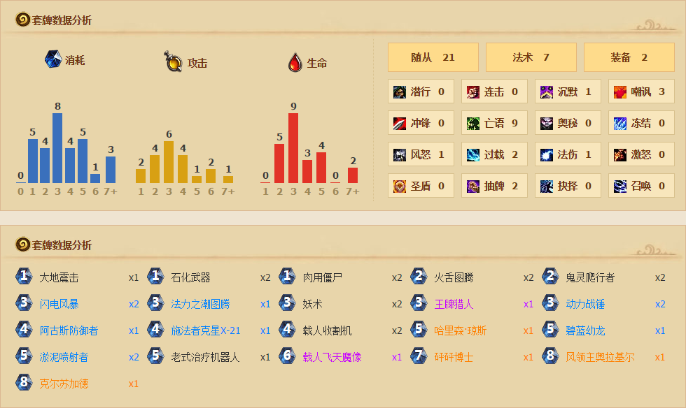 这套萨满吃战士,骑士,德,和法师,猎人,术士都是55开,唯一怕的就是牧师。目前的天梯环境大家也知道,战士,骑士,德占据着大部分。所以,我把这套卡组推荐给大家。