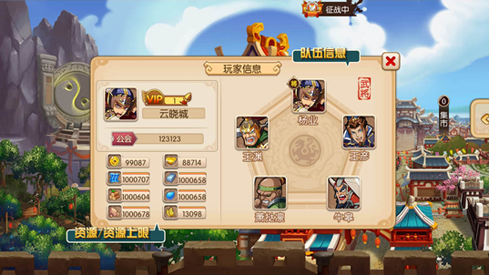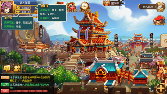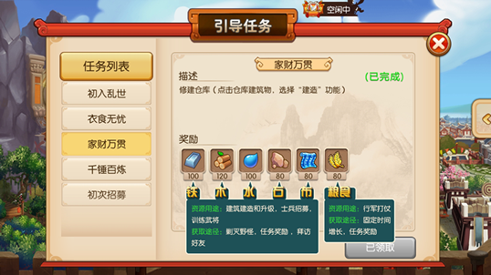 资源是玩家进行战斗、竞技、武将修炼等行为的前提条件。目前游戏内共有7种资源,分别为布、铁、水、木头、石头、粮食、金币