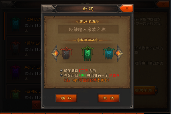 小编看到,家族界面上有好多信息,我们一个一个看呀。 第一个是要输入家族的名称,小编要输入一个非常靠谱的名字“封天瓜果园”,然后选一个漂亮的家族旗帜。不过这时还不可以创建哦,还需要拥有100万金币和一个家族令! 小编不开心,开始有小情绪啦。 怒冲VIp 1,我也要土豪一下。