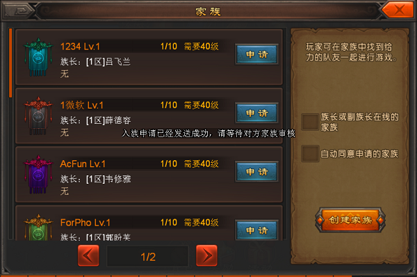 不过,如果想自己创建一个家族进行游戏,也可以通过点击申请界面上的创建家族按钮,这样就可以进行家族的创建啦。