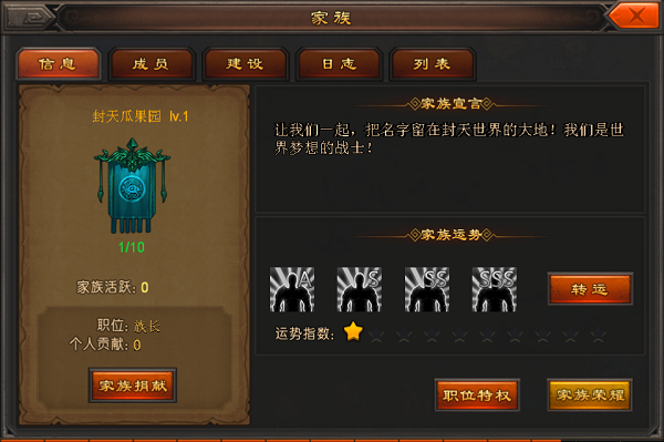 现在,我们点击确认以后,就可以创建自己的家族啦。会直接跳转至家族信息界面哦。 同时提醒一下申请加入其它家族的小伙伴们,申请被该家族的管理人员同意以后,也会出现这个界面哦。