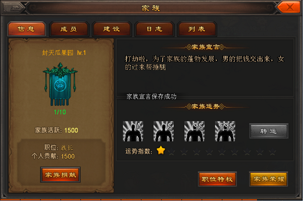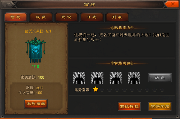 首先在游戏中,我们每次进入家族界面,都会停留在家族信息的界面,这就是小伙伴们家族所有基层信息的显示区域拉。