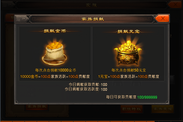 我们可以看到,捐献分为两种,金币捐献和元宝捐献。小伙伴们可以捐献后获得个人贡献和帮派升级所需要的活跃度哦。