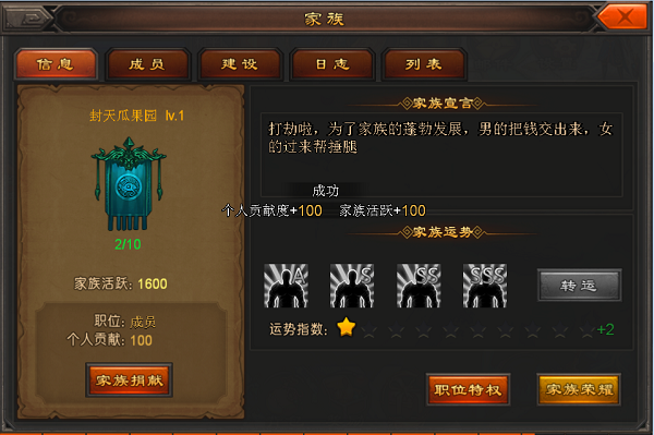 我们通过功能按钮家族捐献,可以对家族做贡献哦,提升个人的贡献度。