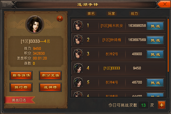 在到湖争锋中,我们可以不断地挑战比自己排名高的玩家,若是挑战获胜即可代替该玩家的排名;并且战斗全程自动进行。所以心有多大胆,就有多大产,只要有实力,你就可以一直往上攀登~