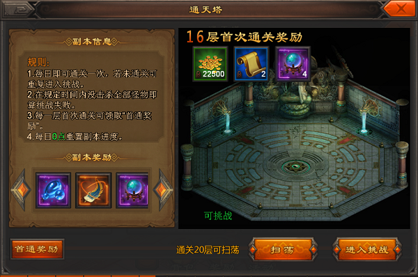 9、 扫荡:每个难度20层通关后,次日副本重置后,可直接通过【扫荡】快速获得奖励。