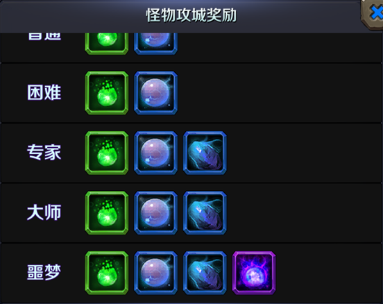 怪物攻城在15级时开放,共分为简单、普通、困难、专家、大师和噩梦六种难度,每种难度都有等级要求,难度越高,掉落的宝物越多,品质也越好。可以在【奖励】按钮中提前预览可能掉落的奖品。