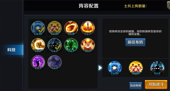 怪物攻城直接调用我们主城的防守阵地,如果感觉自己布置不完善,可以在配置界面点击【前往布防】进行再次修正,建议将防御塔集中到战线前方,集中优势火力,快速消灭怪物,毕竟通关时间越短,奖励越多。