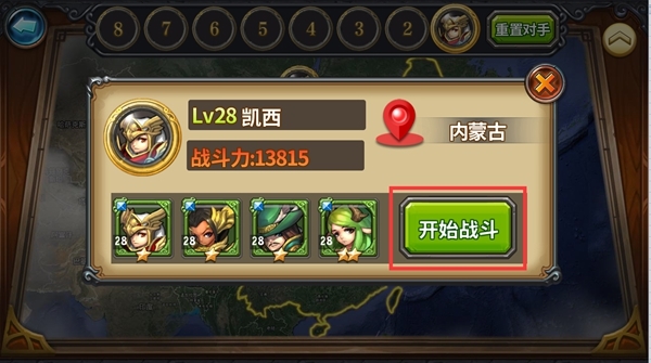 在战斗准备页面可以看到对手详情,包括对手的战力和地区,以及其队伍阵容