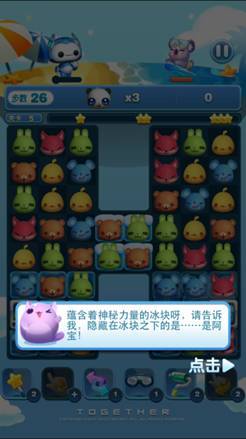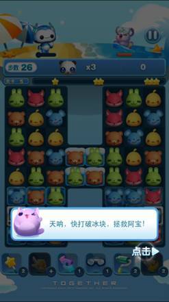 “拯救阿宝”玩法非常有趣,阿宝的藏身之地在游戏中是随机的,每局的位置与数量都不一样,玩家在挑战该关卡中,需要打破冰块,拯救阿宝,只有成功拯救出所有阿宝,才可通关。值得一提的是,造成不要把步数浪费在没有藏阿宝的冰块上。