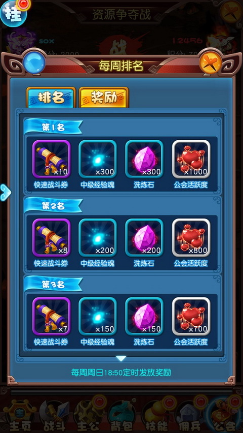 每日资源争夺战结束后,进行每日结算,胜利的公会成员可在挑战BOSS、击杀BOSS获得双倍的荣誉值。每周还会进行一次周排名结算,根据每周的每个公会的胜利场次、总积分进行排名,可获得丰厚的排名奖励。