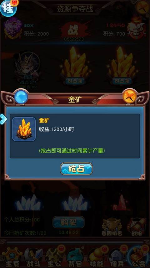 玩家占领某一座矿后,根据矿的品质每10分钟会进行产出资源(积分)。如果玩家自身实力对比对战公会的玩家而言实力较弱,建议不要守卫一个较高品质矿,避免自己守不住,还丢去部分产出。