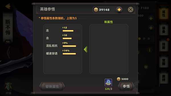每次参悟需要消耗一定的金币、神章卷轴,点击替换属性可以替换已有属性加成。