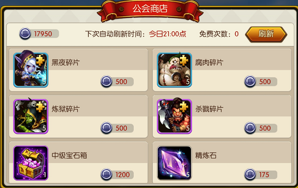 10、加入公会后记得捐献和打公会副本获得个人贡献币,公会商店会有不少好东东,可以兑换杀戮和炼狱这两个资质15的英雄碎片;