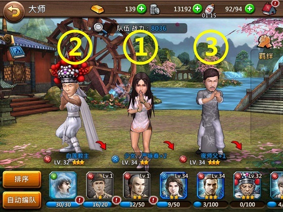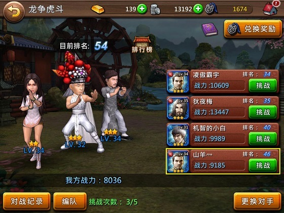 龙争虎斗的玩法是3V3,每位玩家可以派出三位武师轮换上阵,最重要的是,玩家们可以挑选对手,而且可以看到地方的第一位出场的武师,这样就可以根据敌方第一位武师的属性来安排自己的出场顺序!