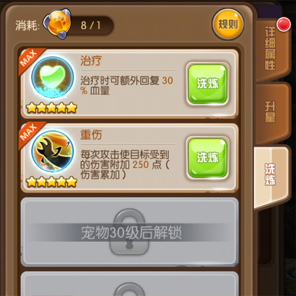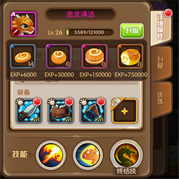 小金龙在等级达到一定级别时,会解锁附加技能,技能的星数越高,效果也就越加给力,当然小编建议要根据宠物的属性来选择技能,因为它是输出型的宠物,最好能洗炼出与之属性搭配的技能,使得它的战斗能力最大化。