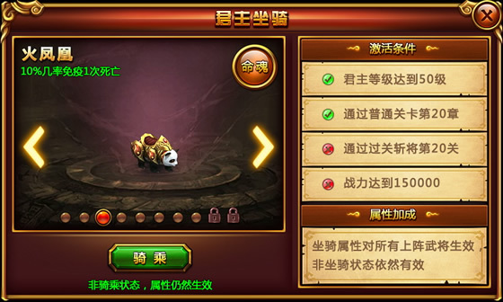 每个坐骑都可以附加命魂,提高所有出站武将的属性。