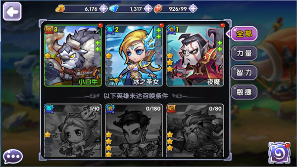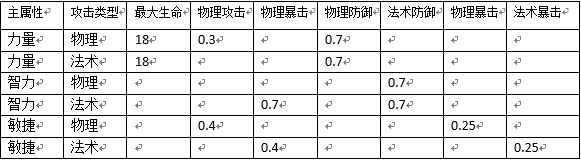英雄分为力量,敏捷,智力三种不同的主属性成长,并且分为物理,法术,神圣三个不同伤害类型,不同主属性成长的英雄,最终的定位方向也将不同。