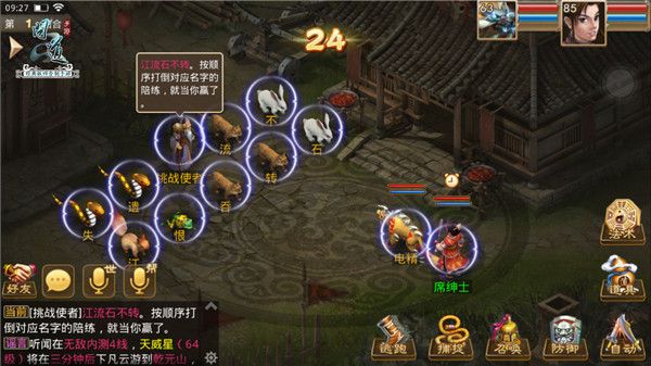 最后,是小编觉得最有文化素养的一种挑战方式。考验团由帮派日常使者带着一群小宠物组成,每个宠物的名字都是一个字,帮派日常使者会吟一句“诗”,玩家要根据帮派日常使者“诗”中字的顺序,攻击对应名字的宠物,选择正确就能顺利取胜,只要不用群攻技能,物理攻击还是单人法术攻击,道友们可自行选择。