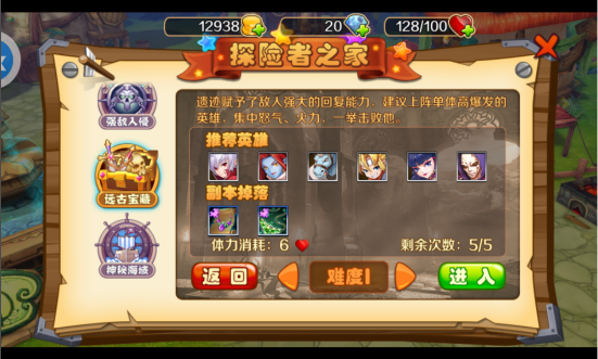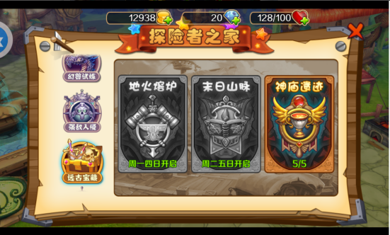 目前远古宝藏共包含三个副本:地火熔炉、末日山脉和神庙遗迹,每个副本的开放日期是不同的,开放的当天每个副本有五次挑战机会,每次挑战成功则扣除一次,失败不减次数。成功挑战副本后,会获得装备碎片,是英雄升阶所必须的道具。副本有多个难度,难度越高,获得的奖励越好。注意:远古宝藏副本是无法使用幻兽来协助战斗的。