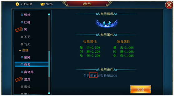 之所以叫资源累积类称号,就是游戏中某一个特定的资源需要达到一定的数量才可领取的称号。比如,拥有10只4星宠物的训宠达人、拥有5只5星宠的训宠宗 师、角色金币数量达到1000W的笑、角色元宝数量达到5000的尊者等。虽然需要累积一定的游戏资源,但上述的这些都是短时间内就可迅速达成领取条件 的。比如训宠达人和训宠宗师,直接开蛋能够搞定;比如笑,金币不够就狂点寻宝和赚金币吧!不过,有一点需要提醒的是,一些称号,比如笑、尊者,达成的条件 是当前拥有,而不是历史拥有!!!所以达到条件一定要及时领取,如果后面把元宝或者金币用掉了,不能领取的时候,恩...你懂的...